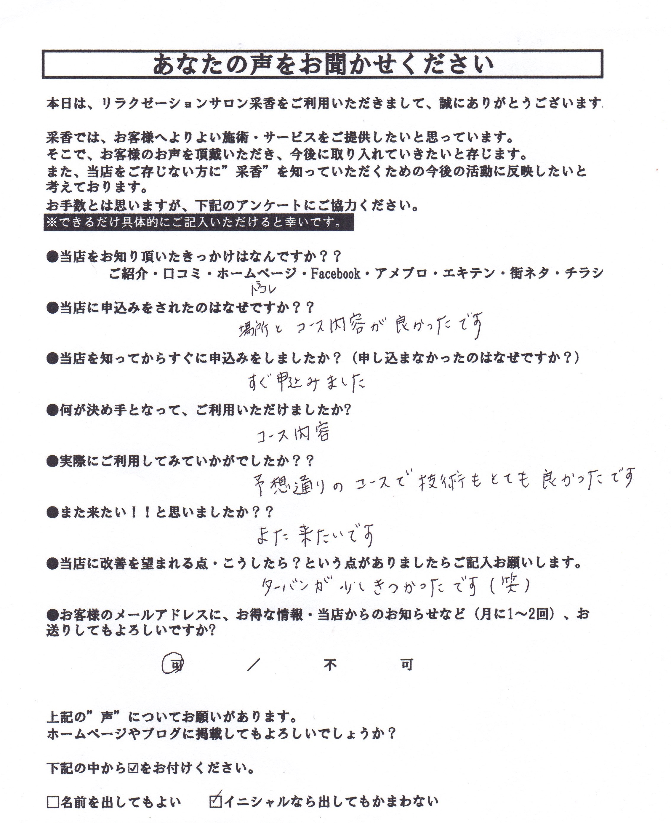 MN様からのお声です アロマトリートメント100分コースをご利用くださいました(*^-^*) ありがとうございます!! ターバン、申し訳ございませんでした(-_-;) 次回、もっと心配りできるように気を付けます(>_<) また何かございましたら遠慮なくお申し付けくださいませ(*´▽`*) ツイート 共有:クリックお願いします!!ありがとうございますo(^▽^)oメールアドレスFacebookTwitter印刷 関連